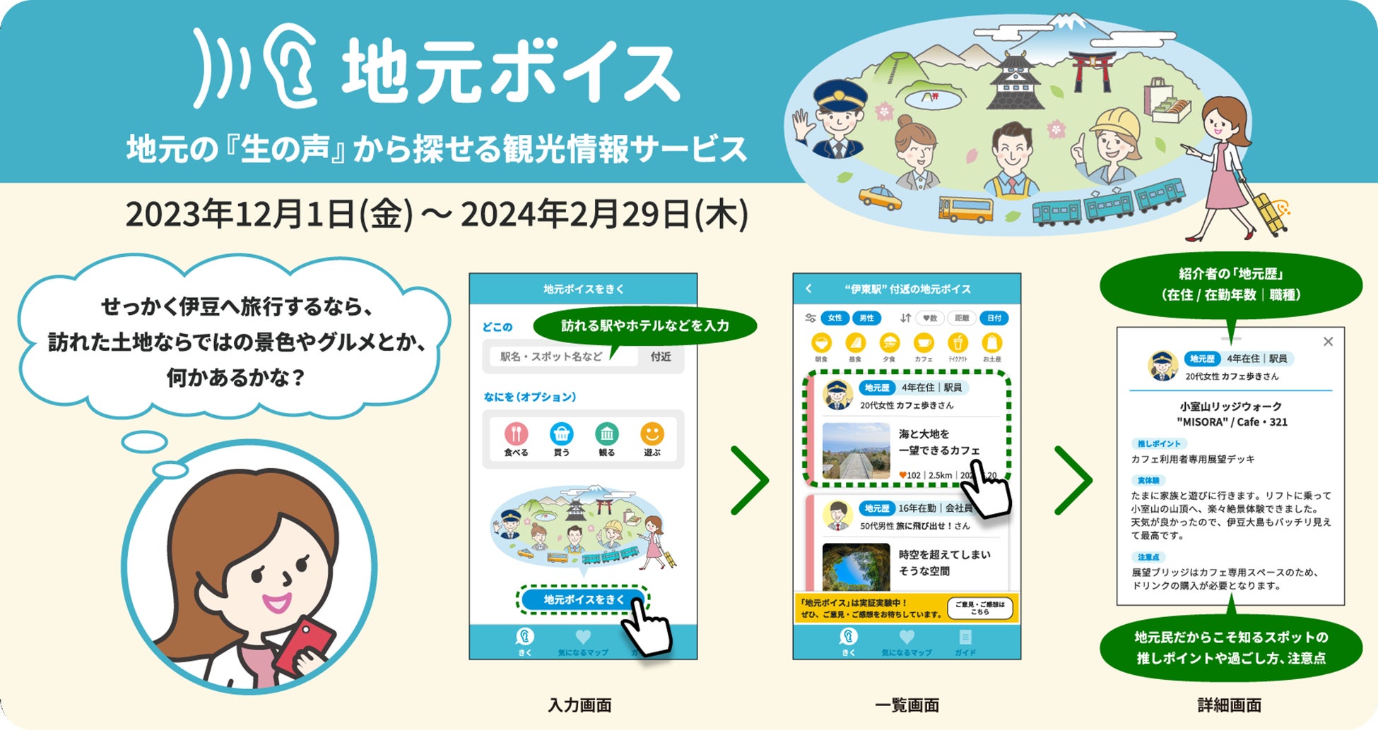 〇東日本旅客鉄道株式会社(本社:東京都渋谷区、代表取締役社長:深澤 祐二、以下「JR東日本」)では、旅の体験・価値向上をめざし、地域・観光型MaaSを提供しています。 〇このたび、伊豆エリアを対象に「地元ボイス ~地元の『生の声』から探せる観光情報サービス~」を開始します。「地元ボイス」を通じ、伊豆エリアで暮らす人や働く人が、こっそりおススメする“穴場スポット”や“通(ツウ)な過ごし方”を発信していきます。 〇JR東日本はこれからも、お客さま向け観光情報サービスの発信に取り組んでまいります。 |