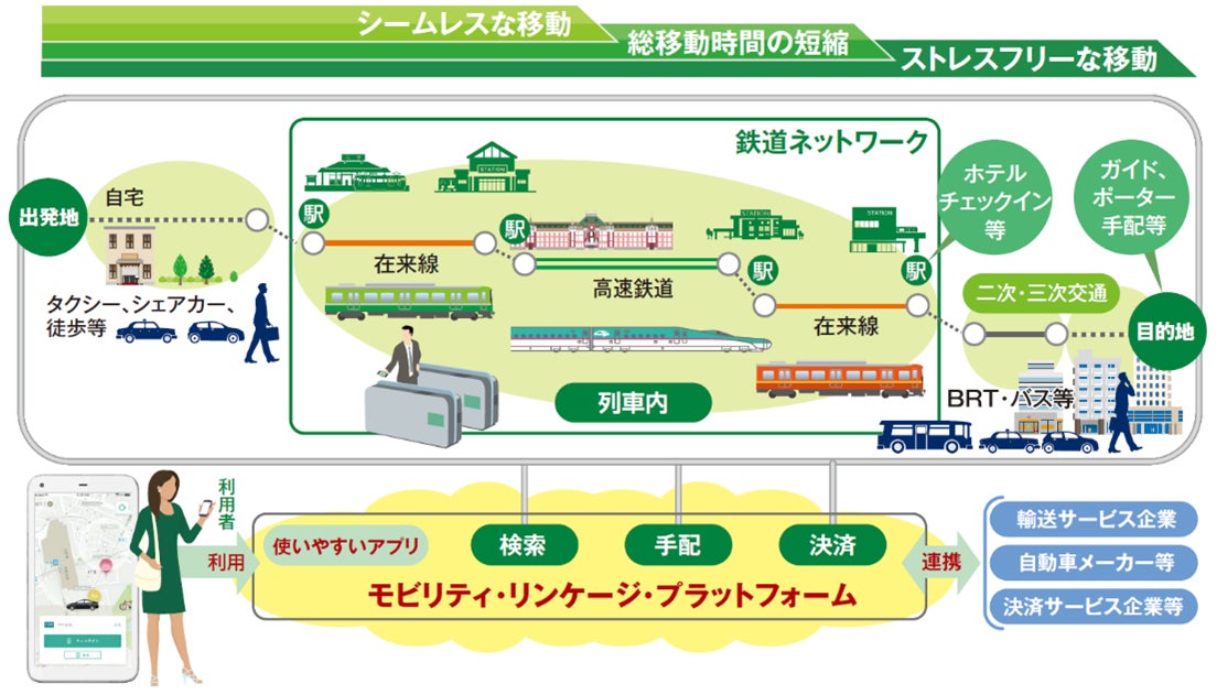 JR東日本は、グループ経営ビジョン「変革 2027」において、移動のための検索・手配・決済をお客さまにオールインワンで提供する「モビリティ・リンケージ・プラットフォーム」を構築し、「シームレスな移動」「総移動時間の短縮」「ストレスフリーな移動」を実現することを目指しています。これにより、お客さまが24時間、あらゆる生活シーンで最適な手段を組み合わせてサービスを利用できる環境を実現します。