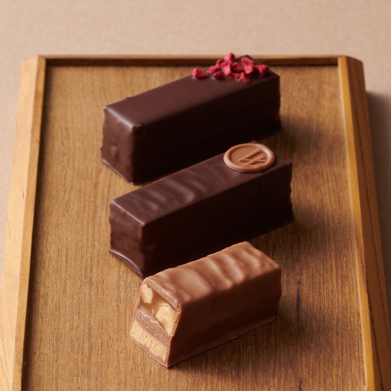 ガトーショコラやクッキーなどの焼き菓子とショコラの層を重ねて、チョコレートでコーティング。 異なる食感が織りなす豊かな味わいをお楽しみください。