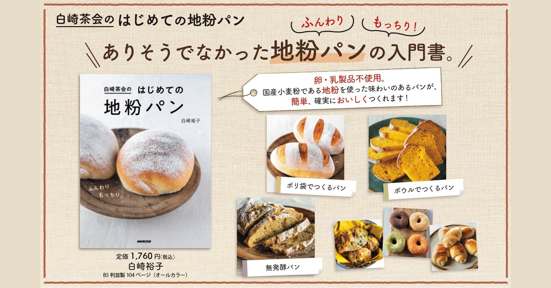 予約のとれない料理教室として知られる「白崎茶会」を主宰してきた白崎裕子さんが、「おいしいパンをつくるなら絶対おすすめ!」という、地粉(国産小麦粉)を使ったパンづくりの本『白崎茶会のはじめての地粉パン』。