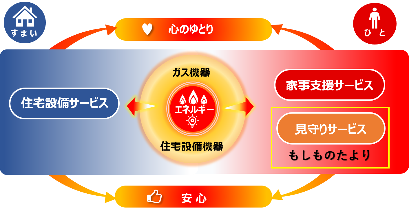 東京ガスグループは、「ひと」と「すまい」を対象に、①住宅設備、②見守り、③家事支援を重点的に取り組むサービス領域と定め、お客さまに「安心」と「心のゆとり」をご提供できるサービス展開・開発を目指します。