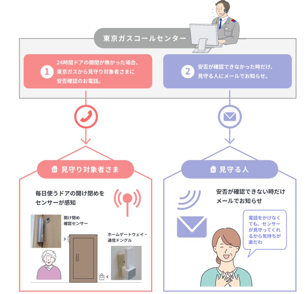 毎日開閉するドアにセンサーを設置、開閉が24時間無い時に東京ガスからお電話で安否を確認、安否が確認できない場合にメールでお知らせする、シンプルな見守りサービスです。