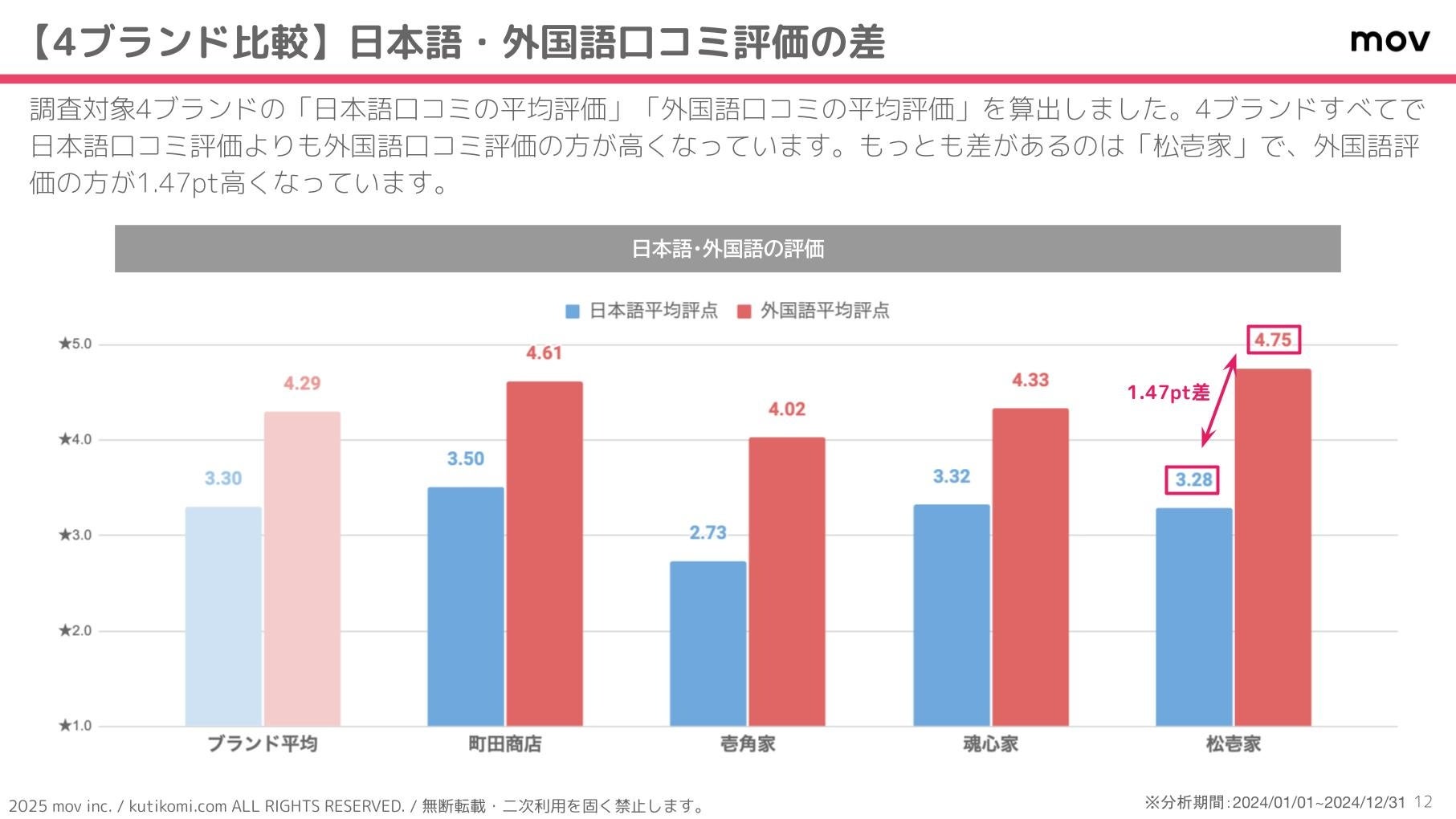 こちらのグラフでは、調査対象4ブランドの「日本語口コミの平均評価」「外国語口コミの平均評価」を算出しています。4ブランドすべてで日本語口コミ評価よりも外国語口コミ評価の方が高くなっています。もっとも差があるのは「松壱家」で、外国語評価の方が1.47pt高くなっています。