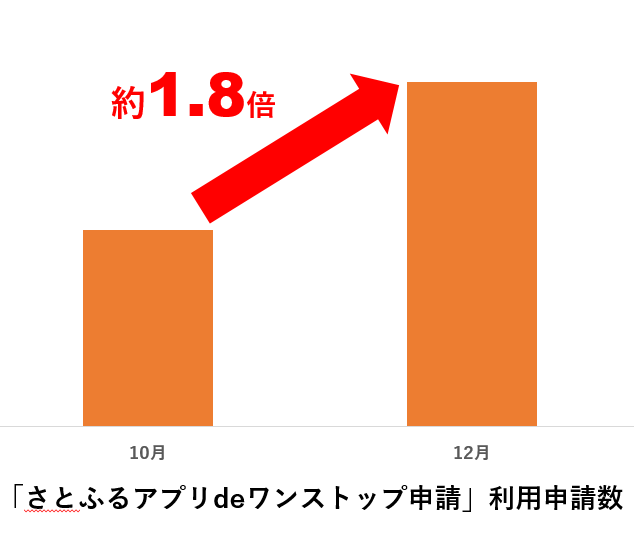 今年12月1日~10日までの「さとふるアプリdeワンストップ申請」を利用した控除申請数は、10月の同期間と比較して約1.8倍に増加しました。年末に向けてふるさと納税の寄付が増加するとともに、控除申請サービスを利用する人も増加していると考えられます。
