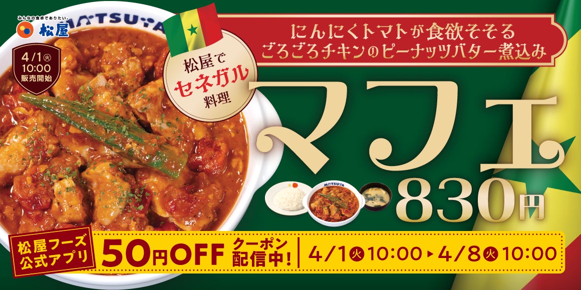 このたび松屋フーズ(本社:東京都武蔵野市、代表取締役社長:瓦葺一利)では、牛めし・カレー・定食・その他丼の「松屋」におきまして、2025年4月1日(火)10時より「マフェ」を販売いたします。