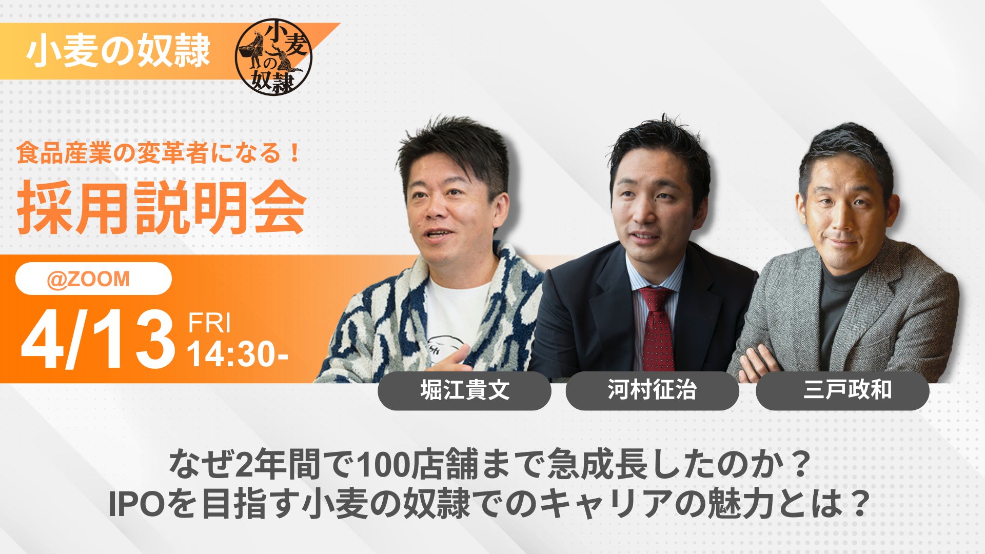 急成長中の【小麦の奴隷】を運営する株式会社こむぎのが、上場を共に目指す幹部人材の募集に関する採用説明会を開催します。説明会には、当ブランドの発案者である堀江 貴文、プロジェクトを統括する河村 征治、当社の資本提携先投資ファンド代表の三戸 政和が登壇します。当ブランドの急成長の理由、今後の展望、募集ポジションやキャリアの魅力に関する説明のほか、ZOOMメッセージでの質疑応答の時間も設けています。