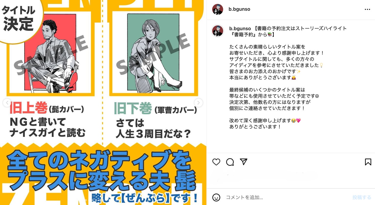 9月26日の発売告知では仮タイトルでしたが、9月28日の投稿で31万人以上のフォロワーに向け、本書のタイトル案を募るという投稿が大きな反響を呼び、1日で1200件を超えるタイトル案が集まりました(コメントで案をいただいた方々には感謝申し上げます)。コメントを参考にタイトルを最終決定いたしました。