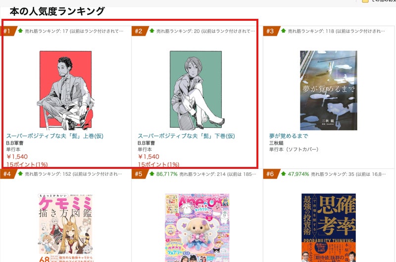 著者 B.B軍曹さんのSNSアカウント(@b.bgunso)にて、9月26日に発売を告知したところ、瞬く間にAmazon本の人気度ランキングが上昇。夫・髭のイラストが入った上巻(仮)が1位、妻・軍曹のイラストが入った下巻(仮)が2位に。まさに夫婦で1・2位を独占!