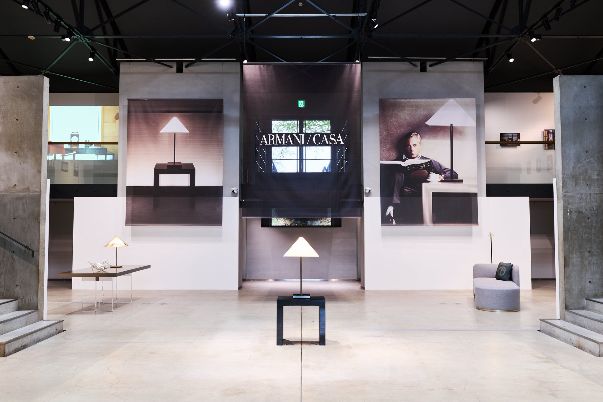 展示の中心に据えられたロゴ ランプとMMoPの自然光が響き合う空間の中で、アルマーニの世界観をご体感いただけます。