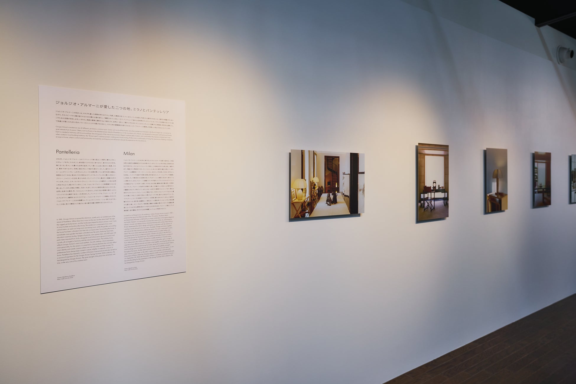 2階では、ミラノ、パンテッレリア、フォルテ・デイ・マルミ、パリ、サントロペ、サンモリッツに構えるジョルジオ・アルマーニの邸宅を、写真と映像によって辿るアーカイブセレクションをご紹介します。