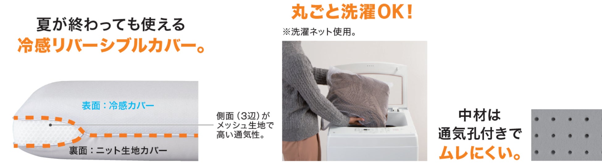 毎年定番のNクールまくらは、「本体も丸洗いできる」仕様を追加することで、より清潔かつ快適にお使いいただけるようになりました。カバーはもちろん、本体の低反発ウレタンも洗濯機で洗えます。
