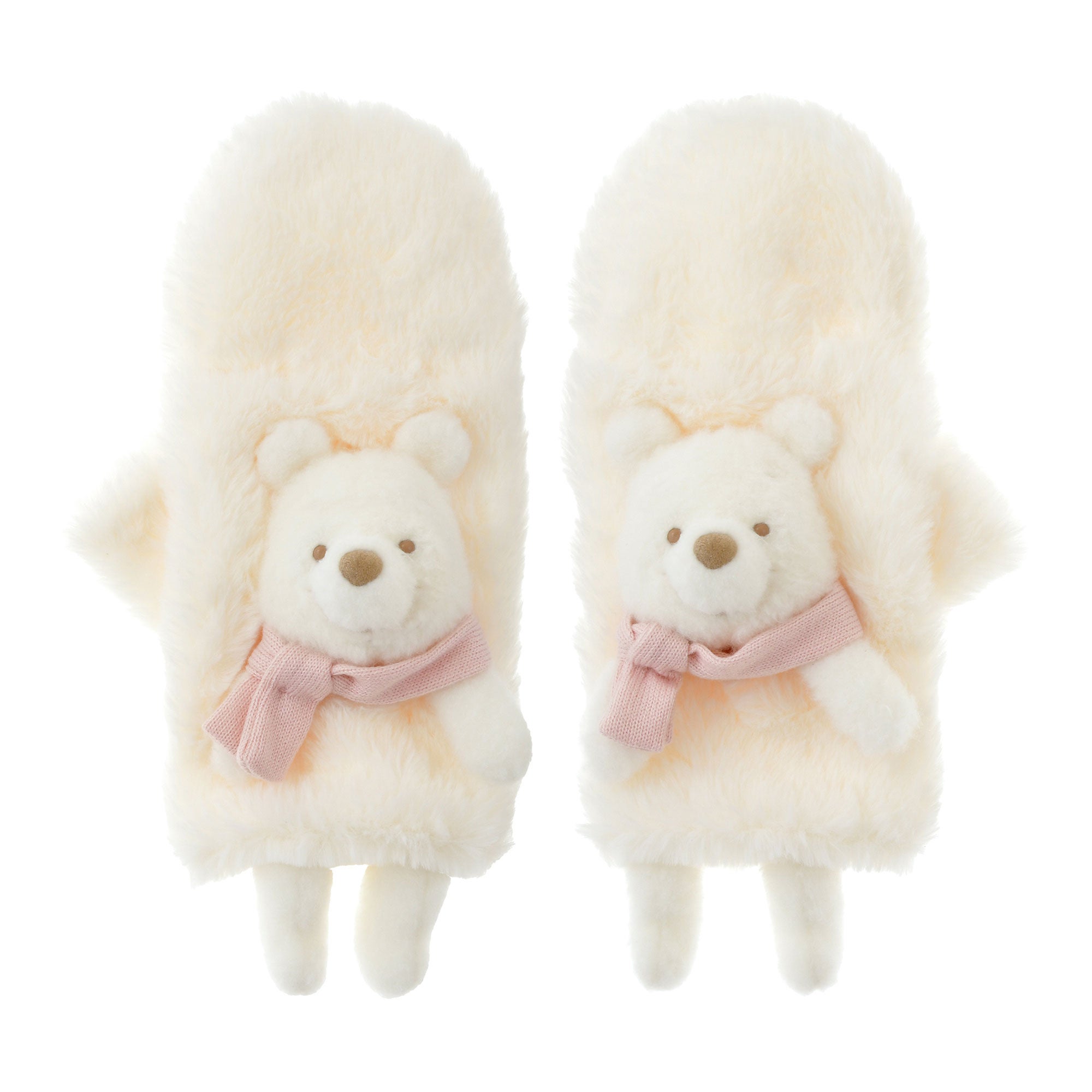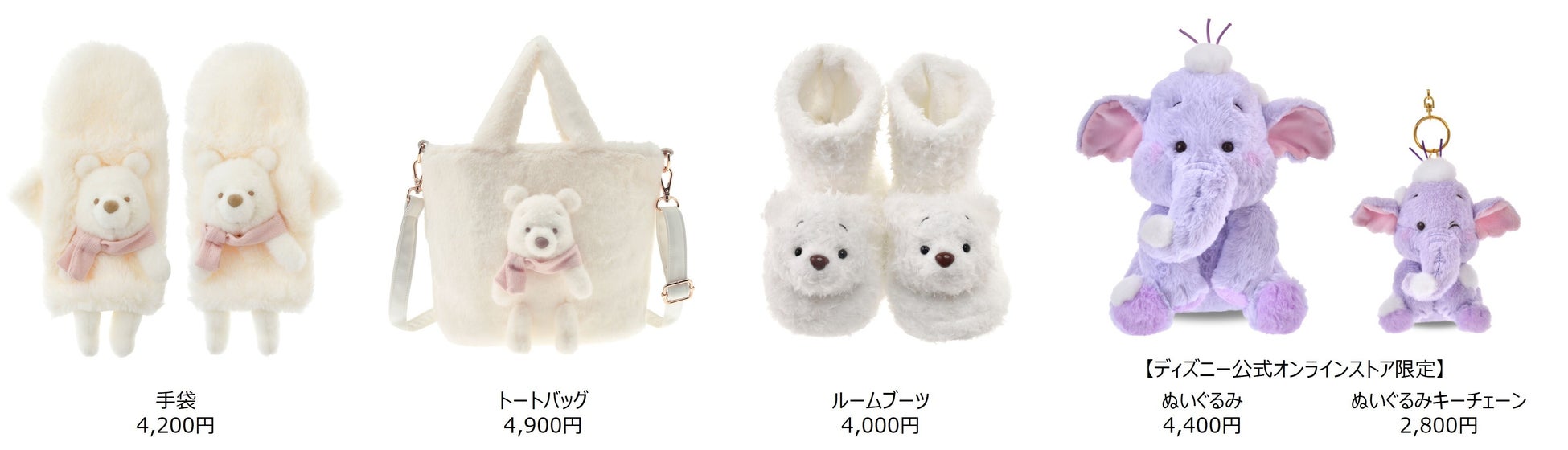 ぬいぐるみやぬいぐるみキーチェーンには、プーさん、ピグレット、イーヨーがラインナップ。雪のように真っ白なふわもこ素材のボディに、“雪が積もる前の姿”が包まれた楽しい仕掛けがポイントです。ディズニー公式オンラインストア限定で、頬をピンク色に染めてお座りしたポーズがキュートなランピーも登場します。そのほか、マフラーを巻いたプーさんの立体的なデザインが愛らしい手袋やトートバッグ、寒い冬にぴったりなルームブーツやティッシュボックスカバーなどもご用意。おでかけ時もおうち時間でもほっこり心温まるアイテムが充実します。
