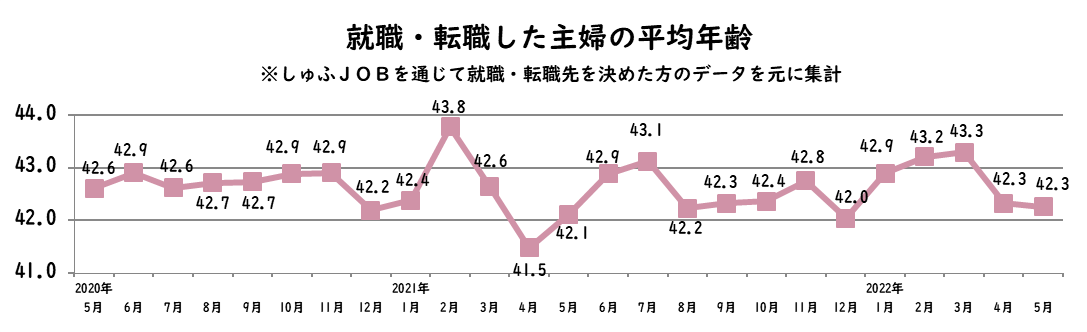 転職主婦の平均年齢は、前月比±0歳、前年同月比+0.2歳の42.3歳となった。