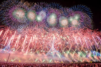 「全国花火競技大会」は全国から選び抜かれた一流花火師たちが日本一を目指して技を競い合う、日本最高峰の花火競技大会です。毎年約18,000発の花火が打ち上げられ、他では見ることができない珠玉の作品をご覧いただけます。ジャルパックでは、会場中央から綺麗に花火を鑑賞いただける「デラックステーブル席」をご用意しました。席数が限られている人気のお席で、大迫力の作品を間近でお楽