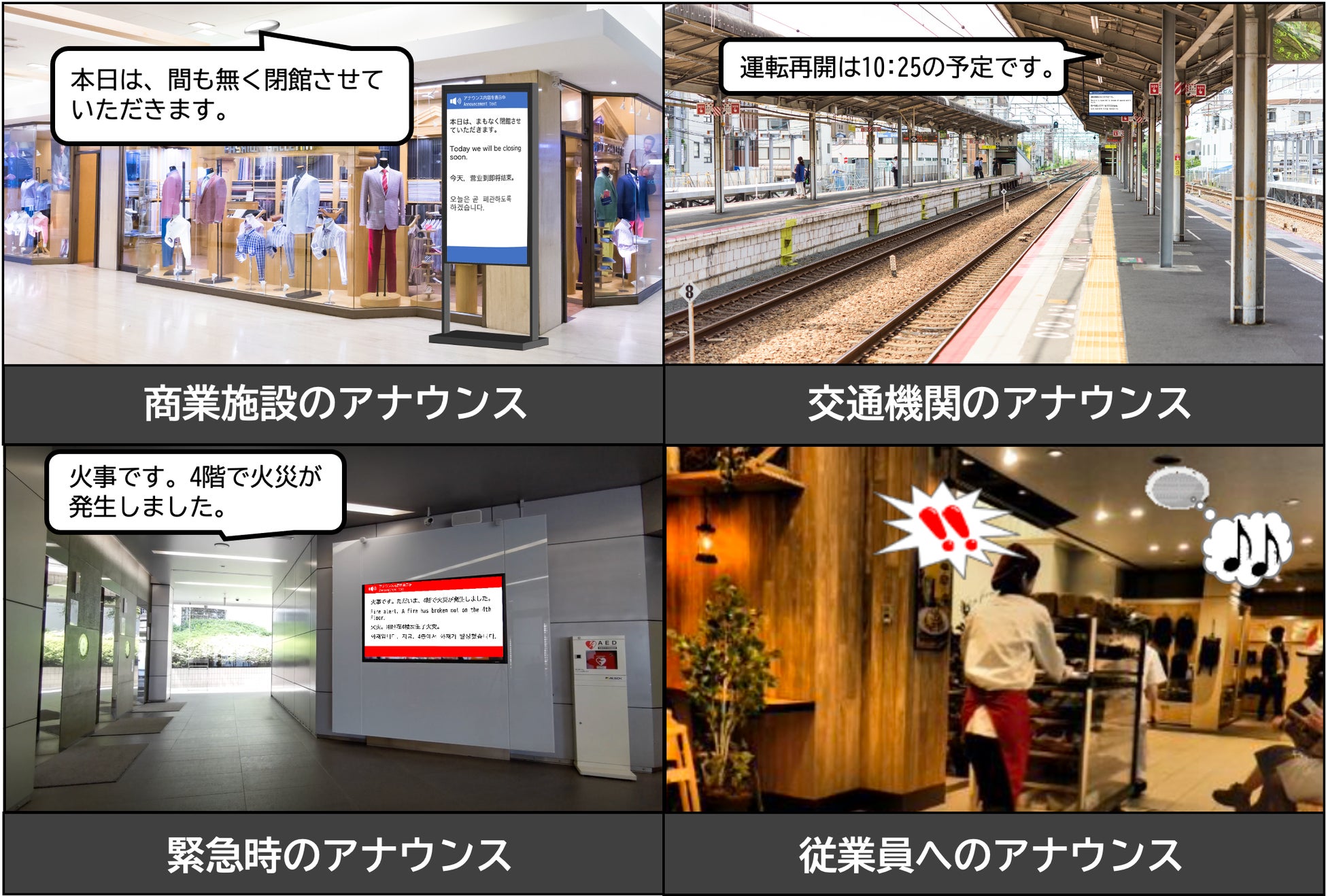 さまざまな業種や状況に対応した汎用アナウンスがプリセットされており、流したいアナウンスをタブレット上で選ぶだけですぐに多言語のアナウンスを流すことができ、プリセットに無いアナウンスは逆翻訳機能付きの商用翻訳サービスと合わせて、オリジナルアナウンスの作成も可能です。音声に連動してアナウンス内容をサイネージに割り込み表示することも可能で、言語や聴覚に不安のある方など多様な方々に等しく情報を伝達できます。商業施設、交通機関などさまざまな施設で導入され、平時や災害時に活用されています。
