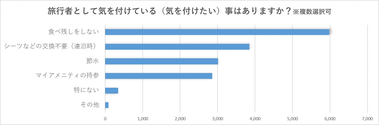 旅行先で気を付けている(気を付けたい)事を問う回答では、8割の人がバイキングなどの食事の際「食べ残しをしない」と回答しました。