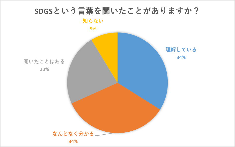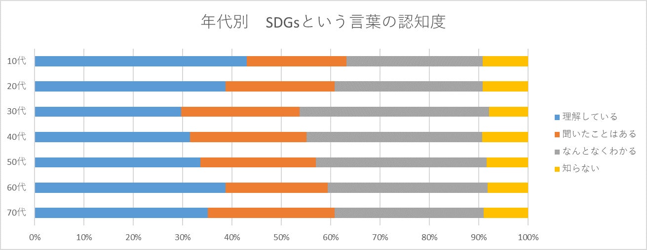 SDGsという言葉は知っているけれど、意味まで理解している人は34%という結果でした。年代別で見ると、学校の授業の一環として学ぶ機会の多い10代の方は43%に上り、20代でも39%と高くなっています。