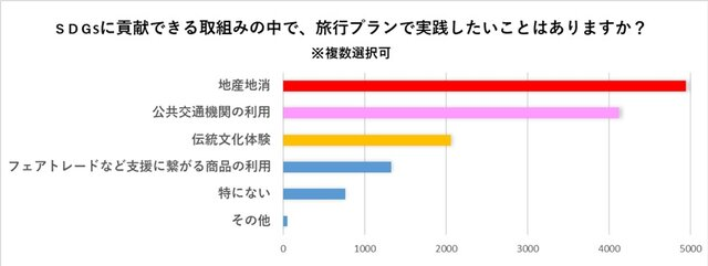 旅行プランで実践したいことを問う答えには「地産地消」「公共交通機関の利用」「伝統文化体験」などが続き、無理せずに楽しめて、結果それがSDGs達成に向けた取組みになっているというプランが求められています。