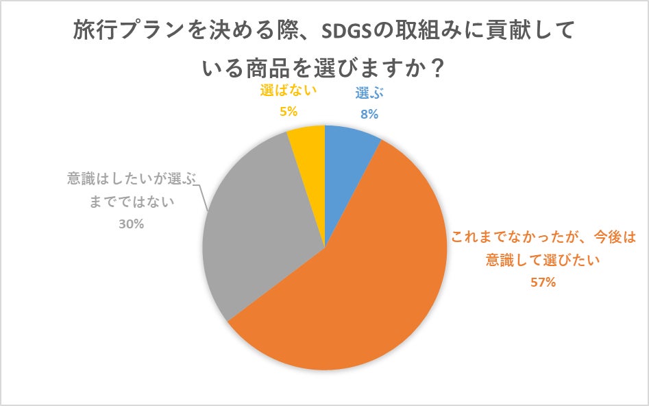 これまで旅行にSDGsを意識した人は少ないが、今後は意識して選びたいという人が57%と圧倒的に多く見られました。一方で、意識したいが選ぶまではないという方も30%という結果に。自由意見では「意識が強すぎると「旅」が台無しになってしまうので、気にしながら楽しい旅をしたい」という声も。