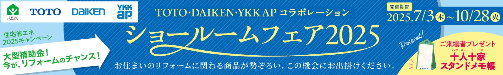 TOTO、DAIKEN、YKK AP(以下、TDY)の3社は、全国のTDYコラボレーションショールーム(※1)で、TDY各社のおすすめのリフォーム商品を紹介し、リモデルを提案する「TDYコラボレーションショールームフェア2025」を7月3日(木)から順次開催します。