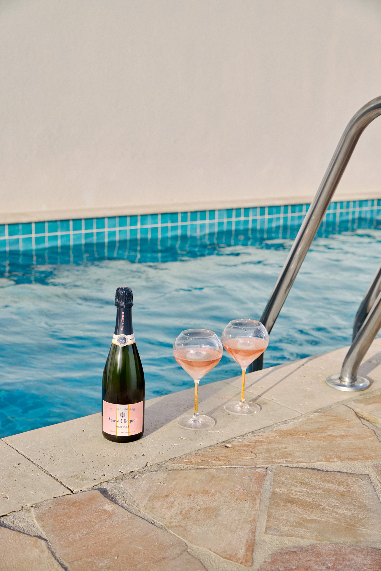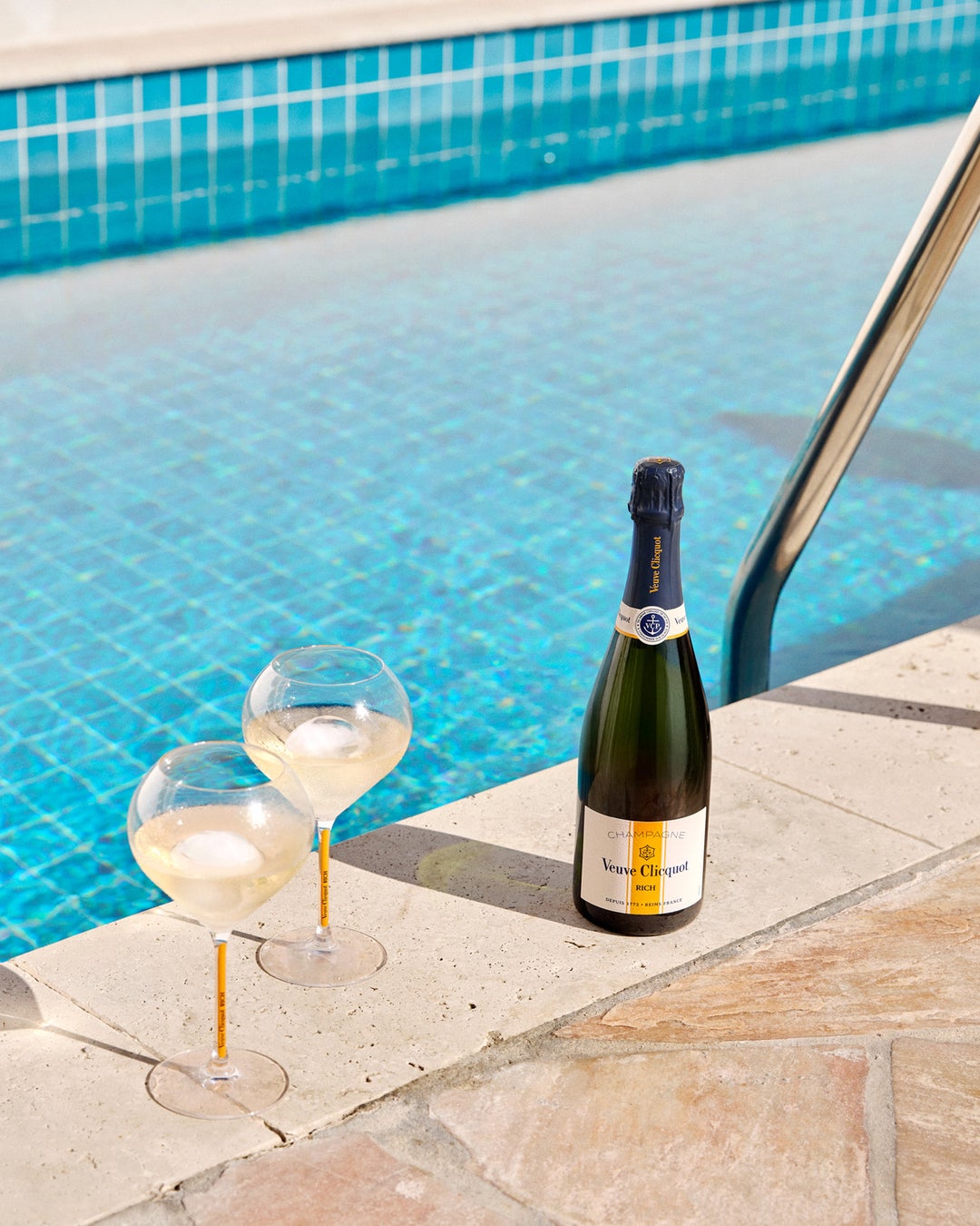 広大でラグジュアリーなプールサイドで、ヴーヴ・クリコカラーに彩られたカバナやサンベッドでリラックスしながら「ヴーヴ・クリコ リッチ オン アイス」を味わう、ラグジュアリーなリゾートタイムをお楽しみください。