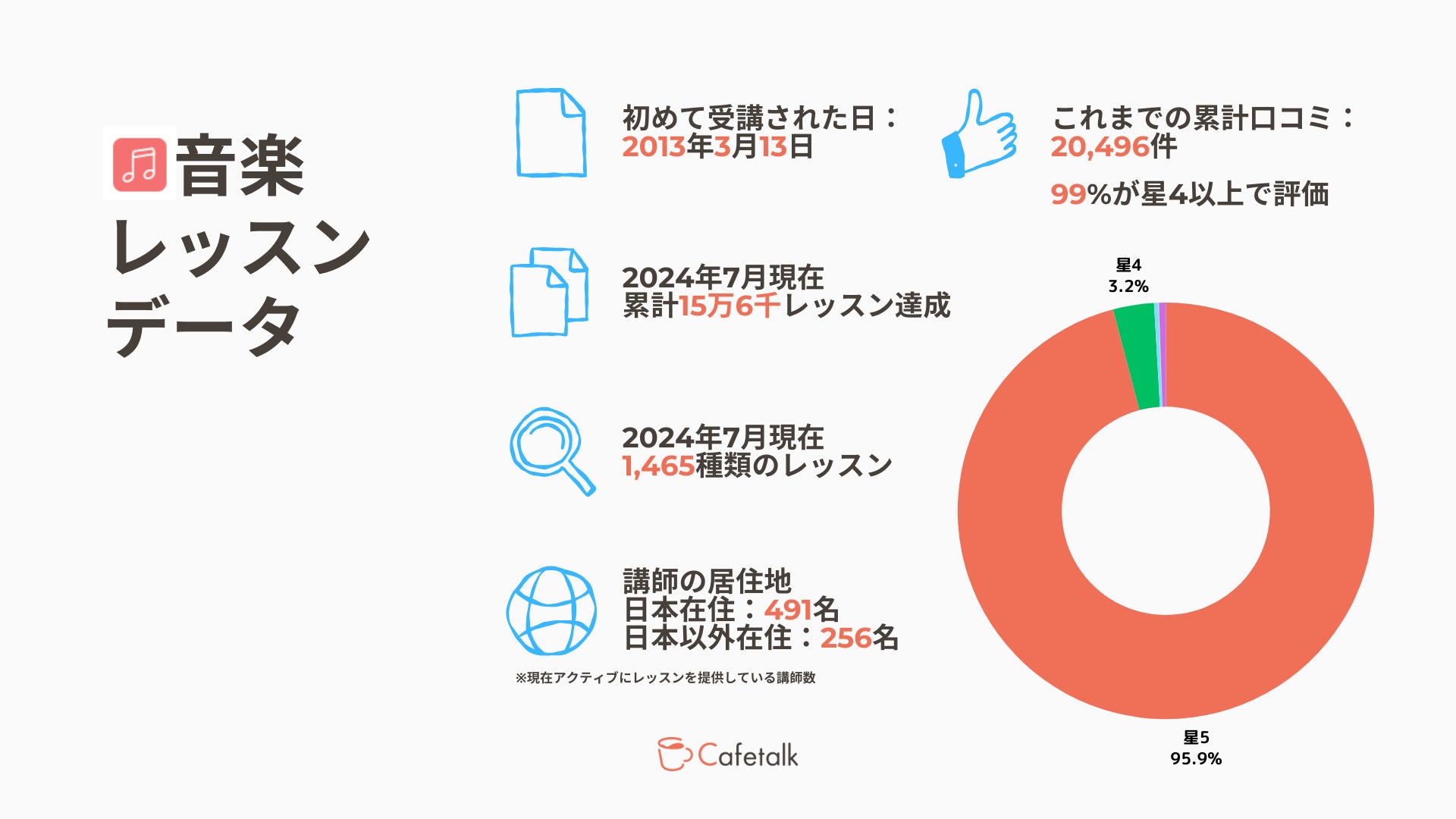 これまでのオンライン音楽レッスンに投稿された口コミは20,496件、うち、99%が星4つ(5点満点)という高評価になりました。