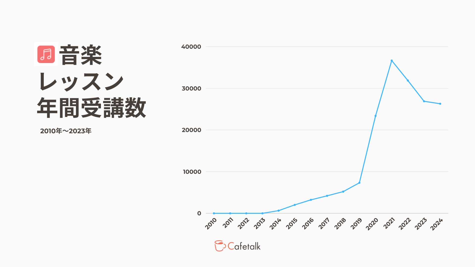 カフェトークで初めてのオンライン音楽レッスンが提供されたのは2013年3月13日、当時わずか2名のピアノ講師がオンラインレッスンを提供開始してから8年、コロナ禍によるおうち時間の増加の影響、通いのピアノ教室閉鎖などの影響を大きく受けレッスン受講数が大幅に増えた2021年には講師登録数累計530名を超え、年間36,000件を超えるオンライン音楽レッスンが提供されるまでとなりました。