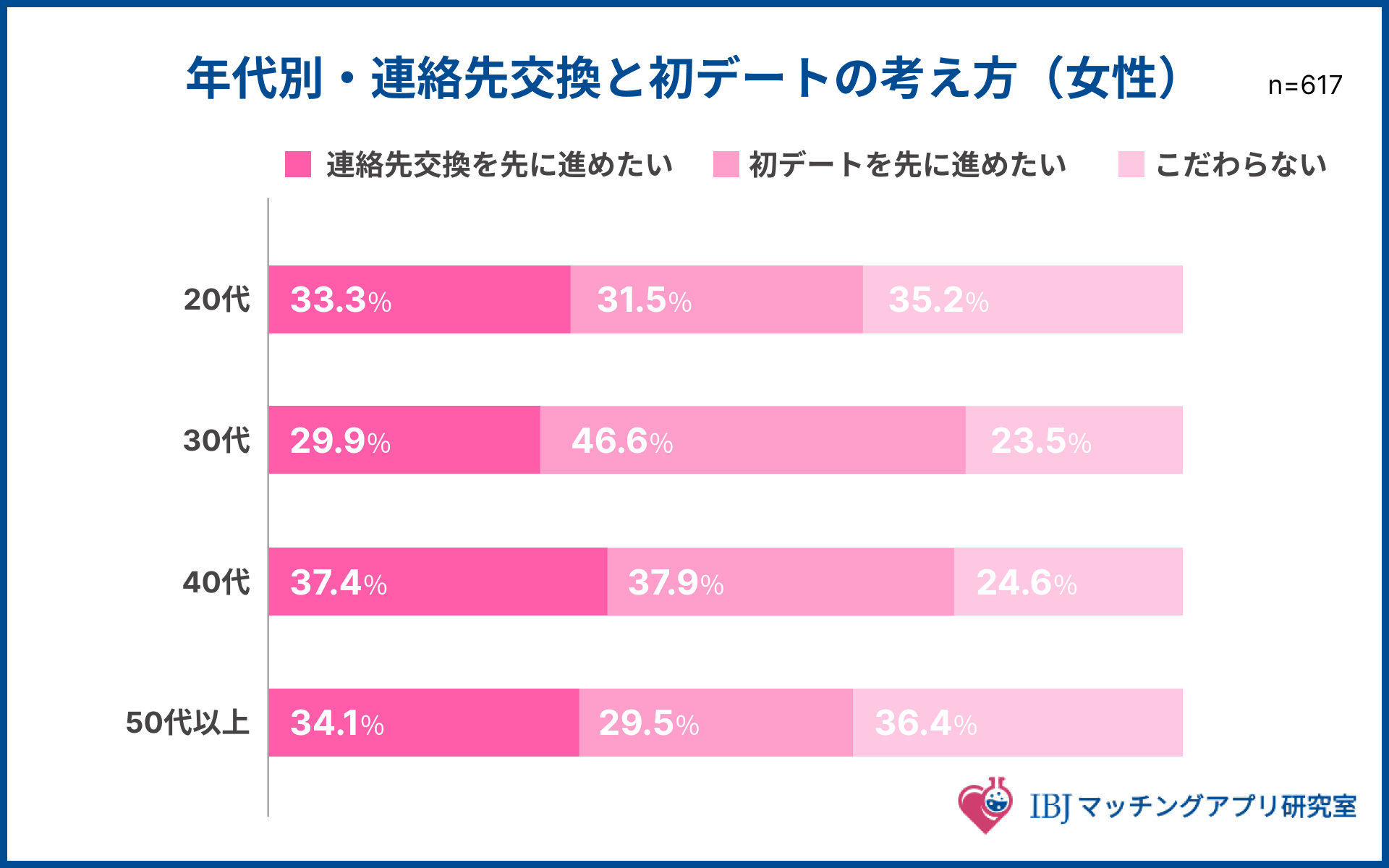 連絡先交換よりも前に、初デートを希望する女性は男性よりも9.9ポイント高い結果に。特に30代女性は半数近くの方が「初デートを先に進めたい」と回答。