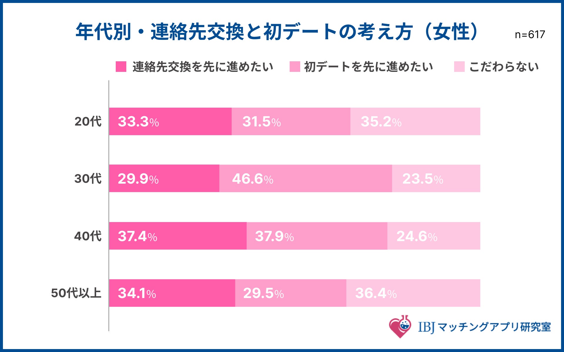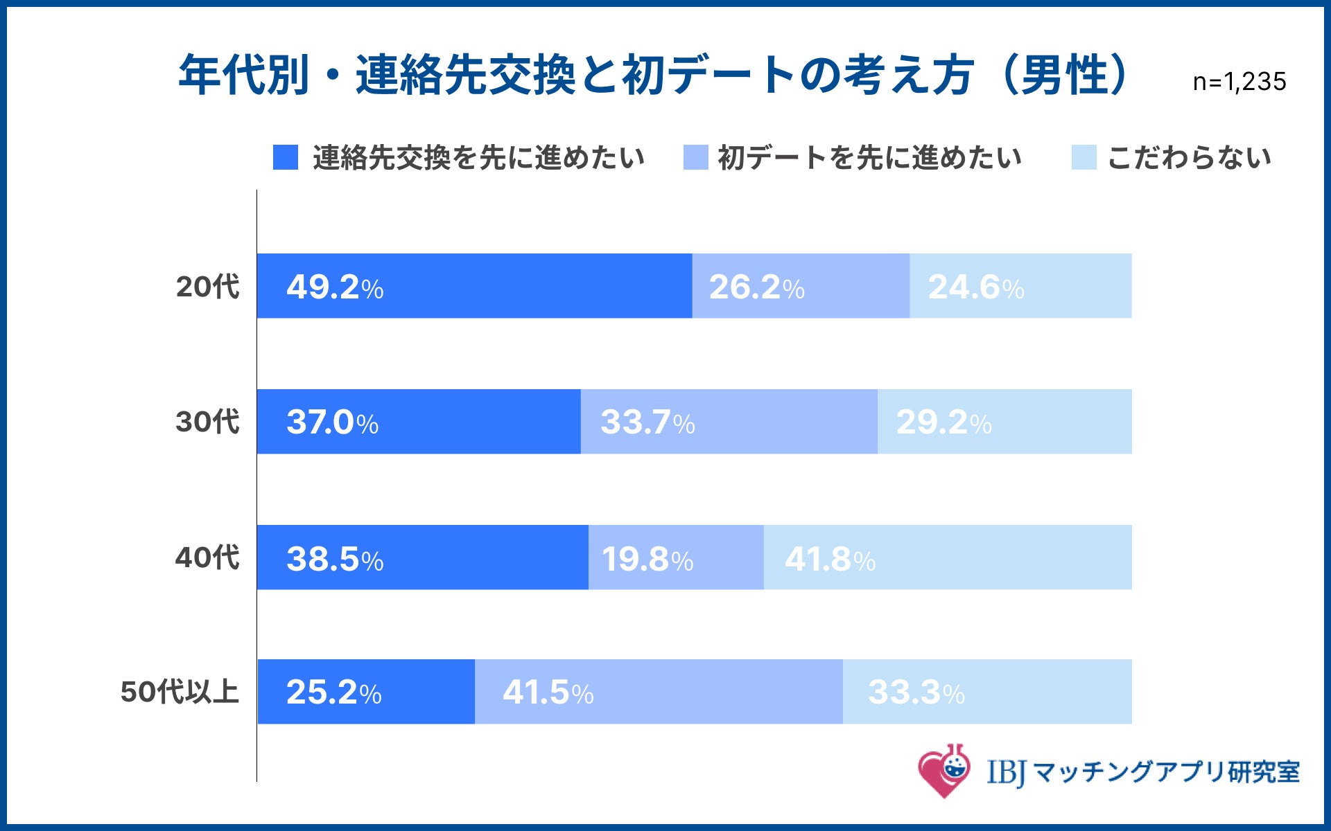年代別で比較をすると、連絡先交換を先にしたいと回答したのは20代男性が49.2%と最も多く、初デートを先にしたいと回答したのは30代女性が46.6%と最も多い結果に。