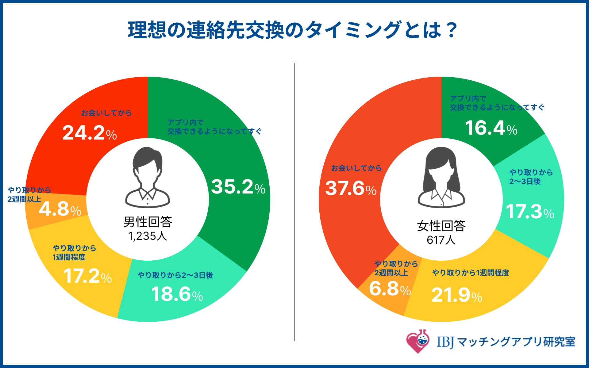 一般的にマッチングアプリは男性が有料、女性が無料の場合が多く、期間限定で活動する男性利用者の場合、退会前に連絡先交換をしておけば、マッチングアプリの利用期間が過ぎた後でも女性とやり取りすることができることから、男女で連絡先を交換するタイミングに差が生まれているのかもしれません。