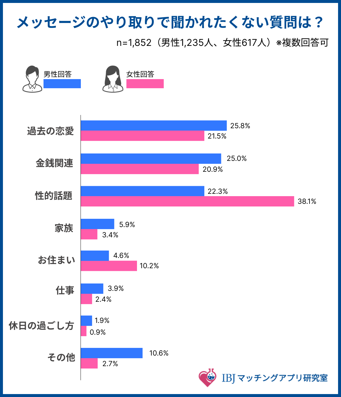 メッセージで聞かれたくない質問として、男性は「過去の恋愛」、女性は「性的話題」が最多に。