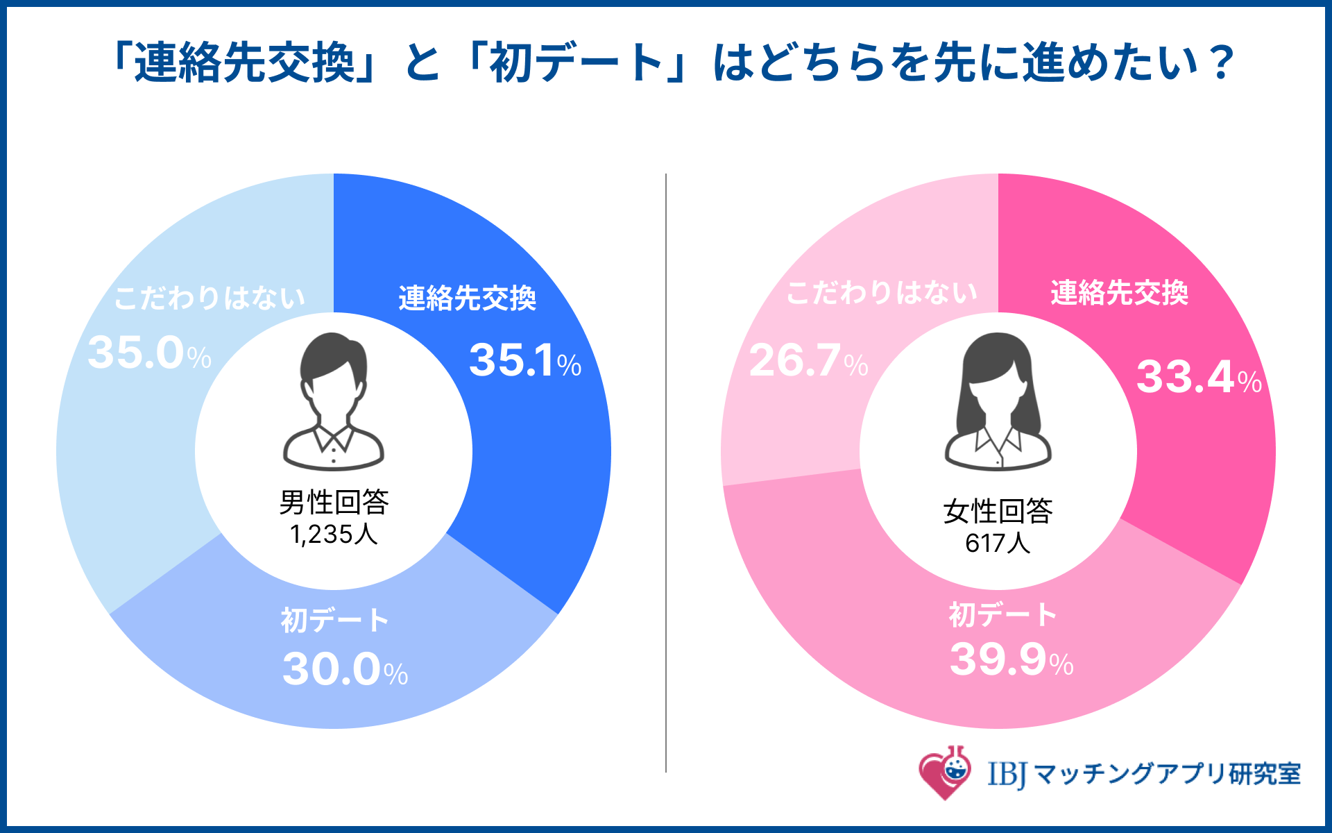 男性は35.1%が「連絡先交換」を先に望んでいるのに対し、女性は39.9%が「初デート」を望んでいる結果となりました。