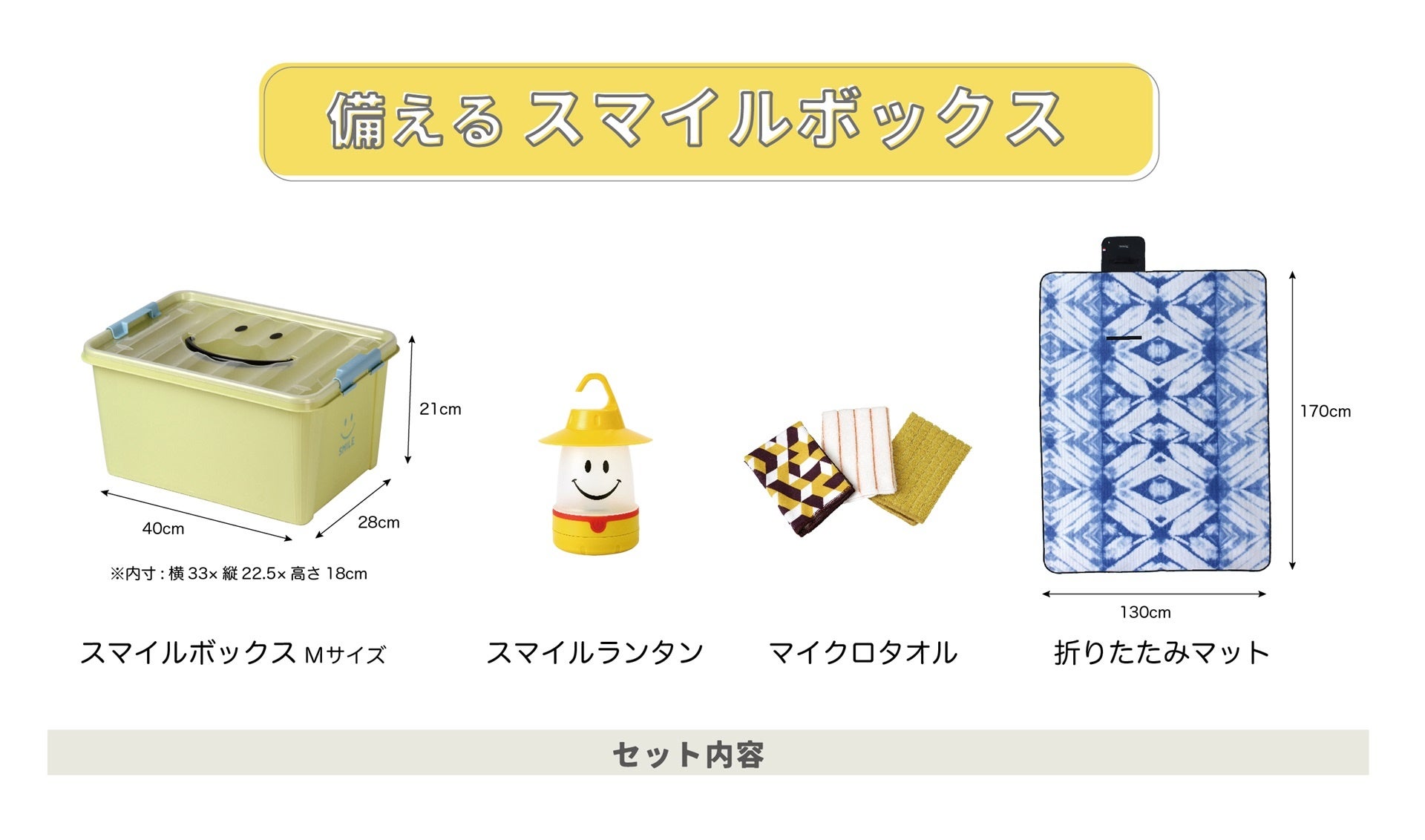 いざという時の、子連れ防災について考えませんか? にっこりスマイルボックスにスマイルランタンとマットをセット。 二次避難、在宅避難を考えて、ここに必要なものを入れて自分だけの防災ボックスを作り、備えましょう。 家族で防災の日を決めて、中身の見直しや話し合いのきっかけにしてほしい思いで作りました。