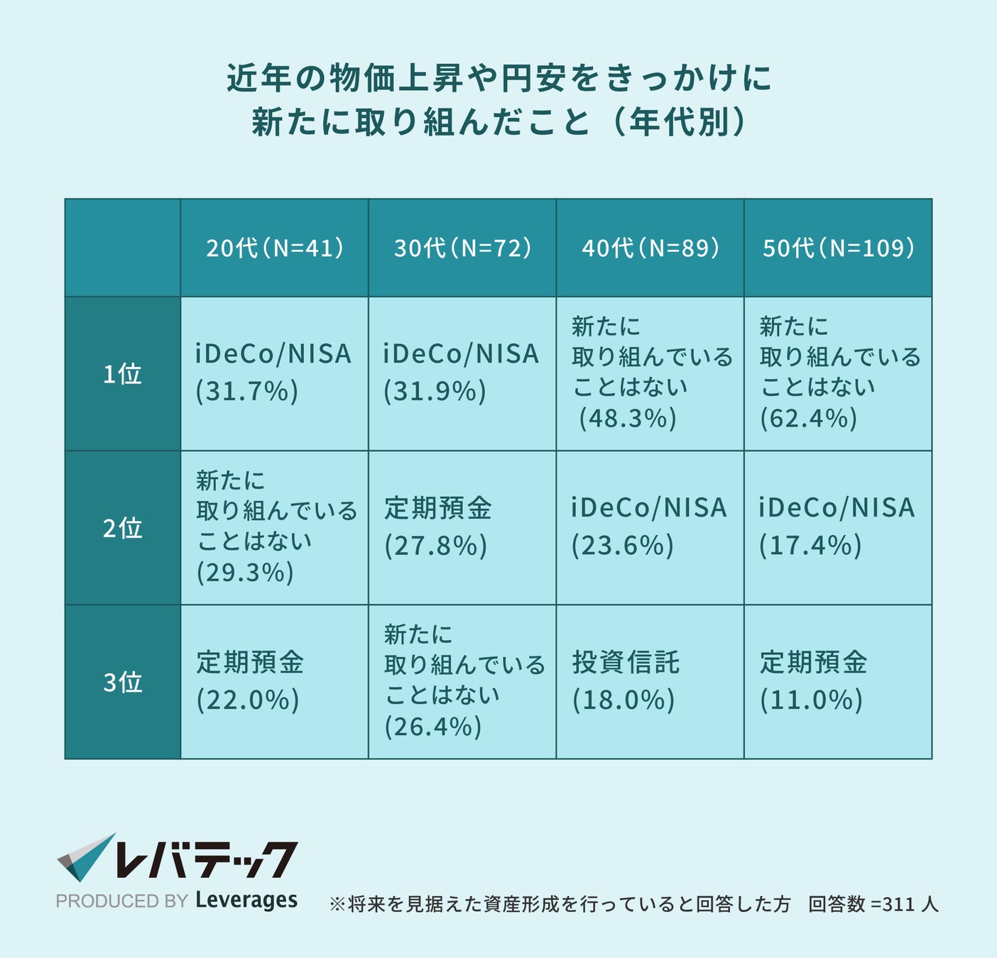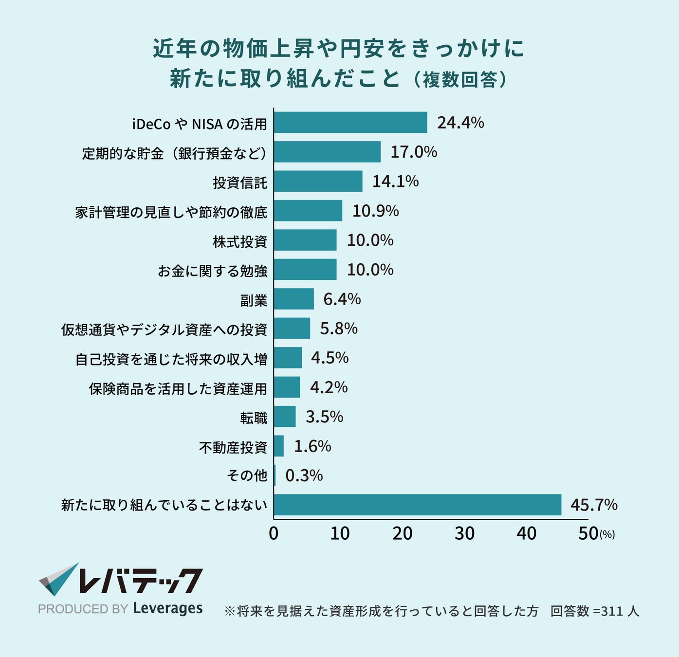 その内訳としては「iDeCoやNISAの活用(24.4%)」が多く、「定期的な貯金(17.0%)」「投資信託(14.1%)」「株式投資(10.0%)」など、様々な方法で資産を増やす動きが見られました。