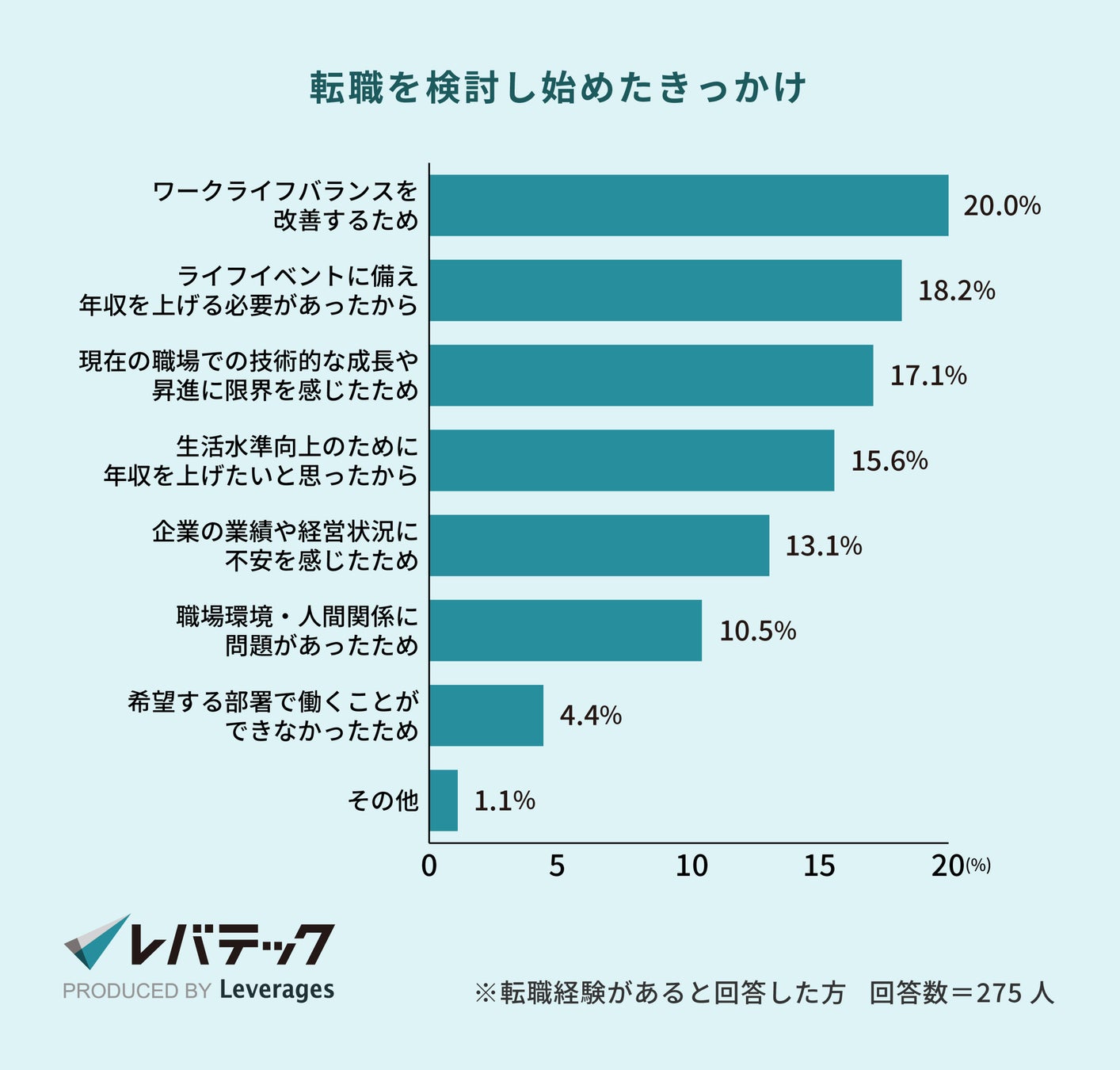 さらに、転職を経験した方に転職を検討し始めたきっかけを尋ねたところ、最も多かったのは「ワークライフバランスの改善(20.0%)」で、次いで「ライフイベントに備え、年収を上げる必要があった(18.2%)」が続きました。結婚や子育てといったライフステージの変化が、柔軟な働き方の確保や経済的な安定を求める契機となり、キャリアの選択に影響を与えていることがうかがえます。