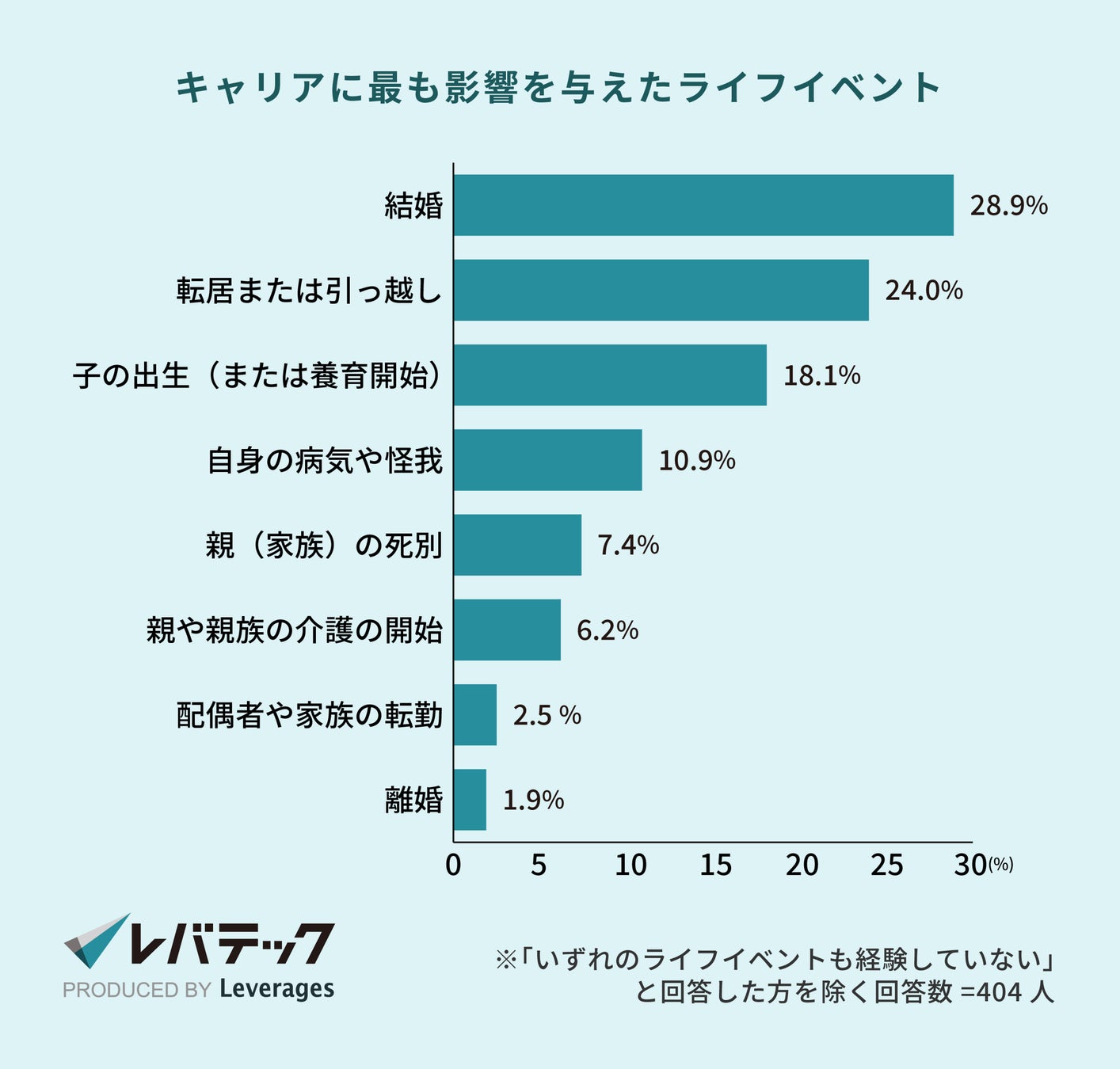 キャリアに最も影響を与えたライフイベントについて尋ねたところ、「結婚(28.9%)」が最多となり、次いで「転居・引っ越し(24.0%)」「子の出生(18.1%)」が続きました。
