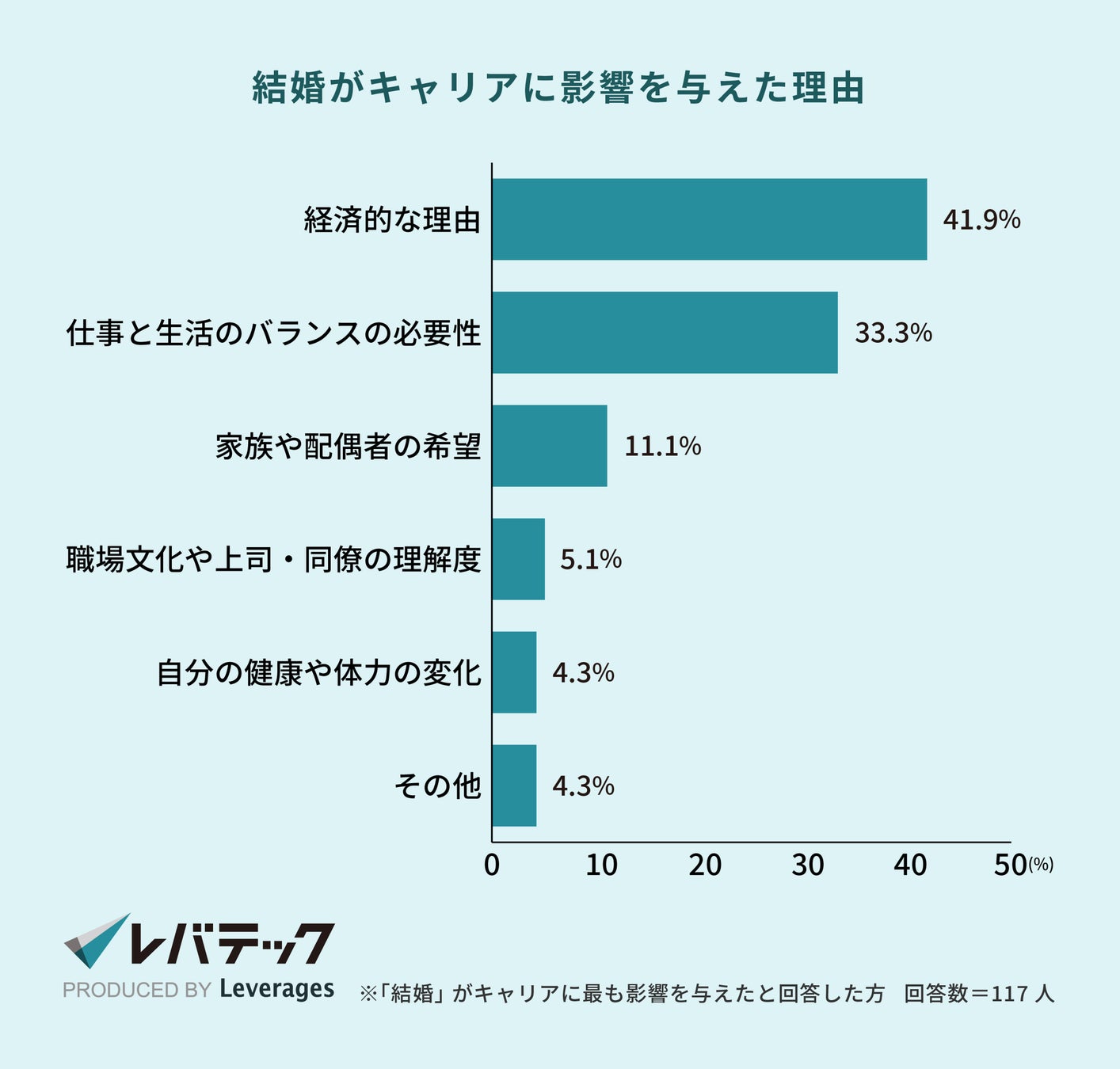 結婚がキャリアに影響を与えた理由としては、「経済的な理由(41.9%)」や「仕事と生活のバランスの必要性(33.3%)」が挙げられました。また、子の出生においても「仕事と生活のバランスの必要性(43.8%)」「経済的な理由(28.8%)」といった理由が多く、いずれのケースでもライフイベントが収入面や働き方に大きな影響を及ぼしていることが分かります。