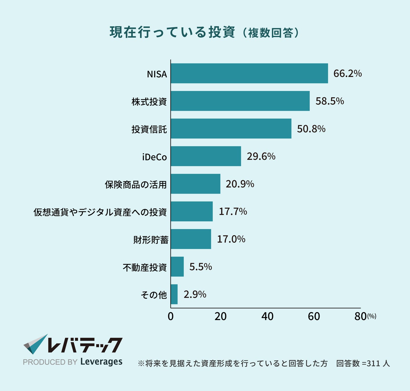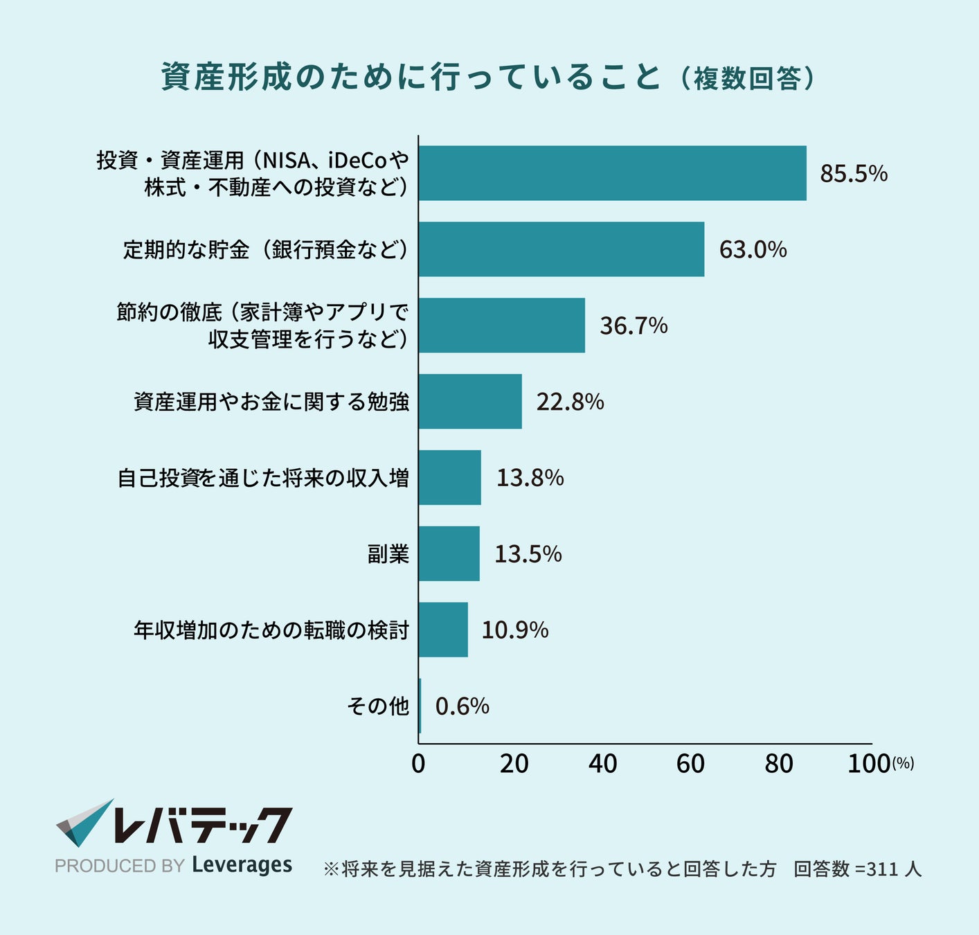 資産形成の手段として最も多く選ばれているのは「投資・資産運用(85.5%)」で、中でも「NISA」を活用している人は約66%に達しました。