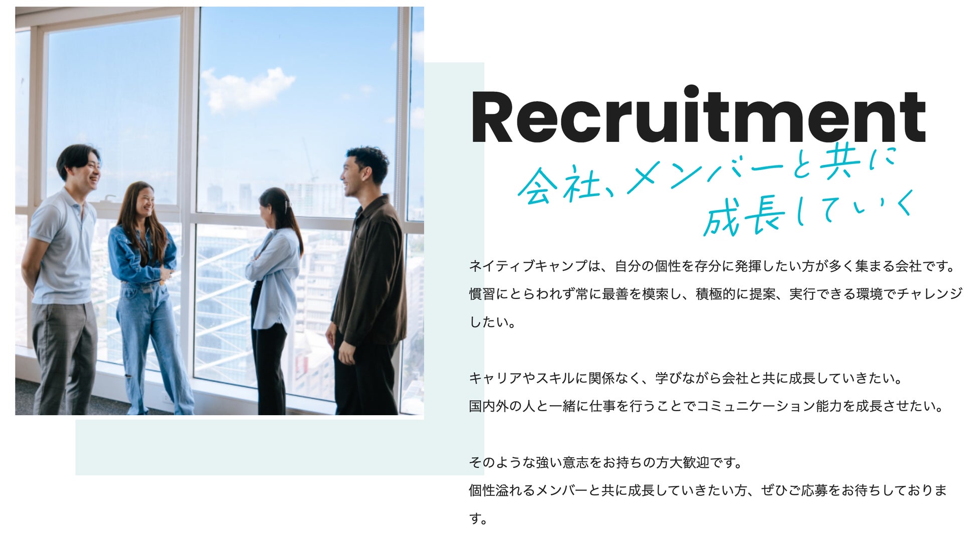 ネイティブキャンプにご興味をお持ちいただいた皆さまに、弊社のビジョンをより分かりやすくお伝えするため、採用サイトのデザインを一新しました。このリニューアルを通じて、優秀な人材との出会いを促進し、さらなるサービスの充実と事業の拡大に向けて取り組んでまいります。