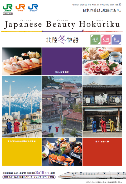 2024年3月16日の北陸新幹線金沢~敦賀間開業と、来年秋の北陸デスティネーションキャンペーンを控え、ますます盛り上がる北陸に向け、JR東日本・JR東海・JR西日本では北陸三県誘客促進連携協議会(※)と連携のもと、「Japanese Beauty Hokurikuキャンペーン」を半年間(2023年10月~2024年3月)に拡大して開催しています。