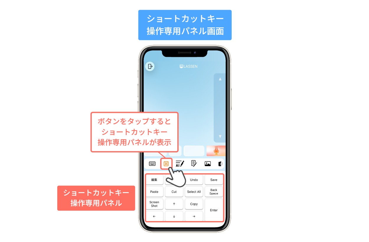 「AmiVoice トークマウス」のiOSアプリのメイン画面下部に、「ショートカット機能」のアイコンを新たに追加し、アイコンをタップするとショートカットキー操作専用のパネルが表示され、コピー・ペーストなどの操作をワンタップで実行することができます。