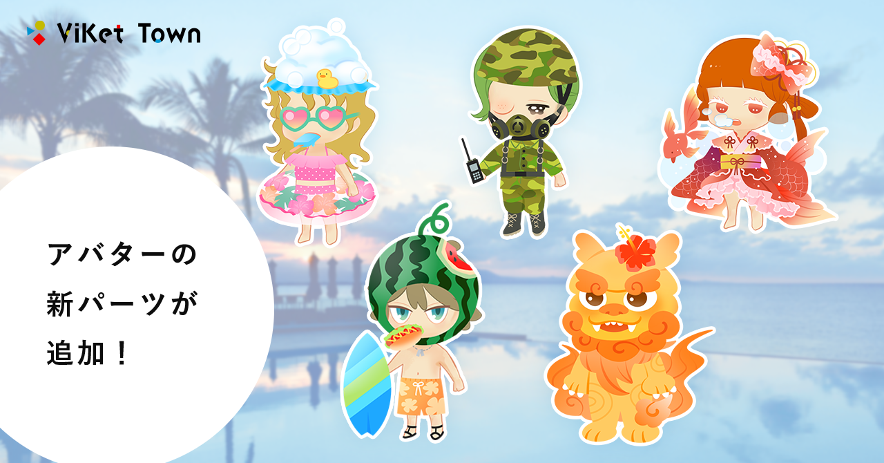 「ViKet Town(ビケットタウン)」では自分となって働くアバターが存在します。アバターには、頭、髪、目、口、服装、数種類の初期パーツから選択する事ができ、理想とする自分を生み出す事が可能です。 アバターを通してのコミュニケーションは、年齢、国籍、性別、見た目、生まれ持ったルーツによる様々な偏見をなくし、 純粋な気持ちで仲間とのプロジェクトの成功を目指す事ができます。 自分に自信がない人でも、働く新たな自分を生み出すことで、コミュニケーション能力の向上も期待でき、異空間で働くアバターは、様々なアイテムを身に着け、仲間とのコミュニケーションのきっかけともなります。今回8月のアバターは、夏本番!気分を盛り上げる新作水着や鮮やかな金魚モチーフ、シーサーモチーフのパーツが登場します。