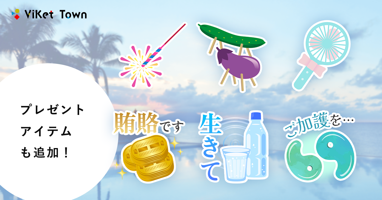 ViKet Townではプレゼントやメッセージ付きアイテムも毎月更新中。8月のイベントにちなんだ手持ち花火や精霊馬が追加!さらにミネラルウォーターやハンディファンなど、涼やかなアイテムも登場!