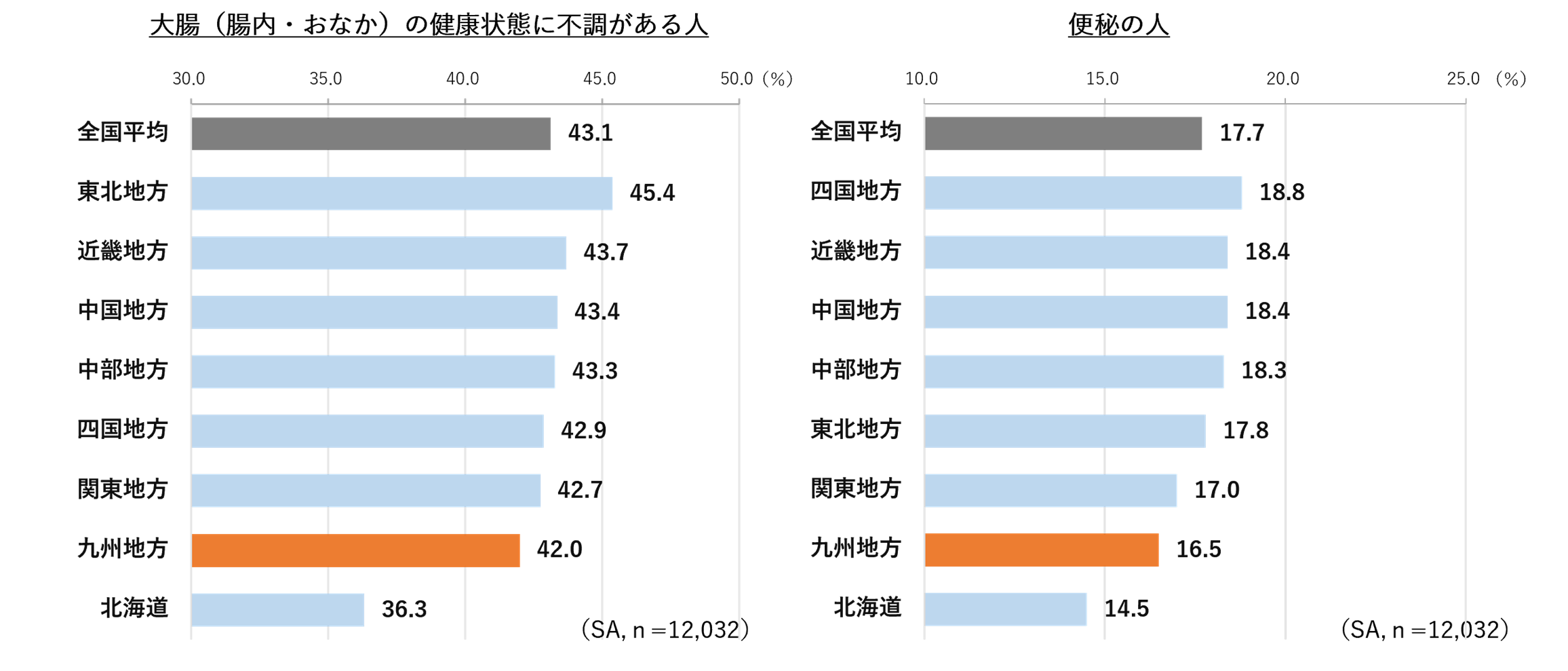 ①九州地方全体では「大腸に不調がある人」も「便秘の人」も全国平均並み。