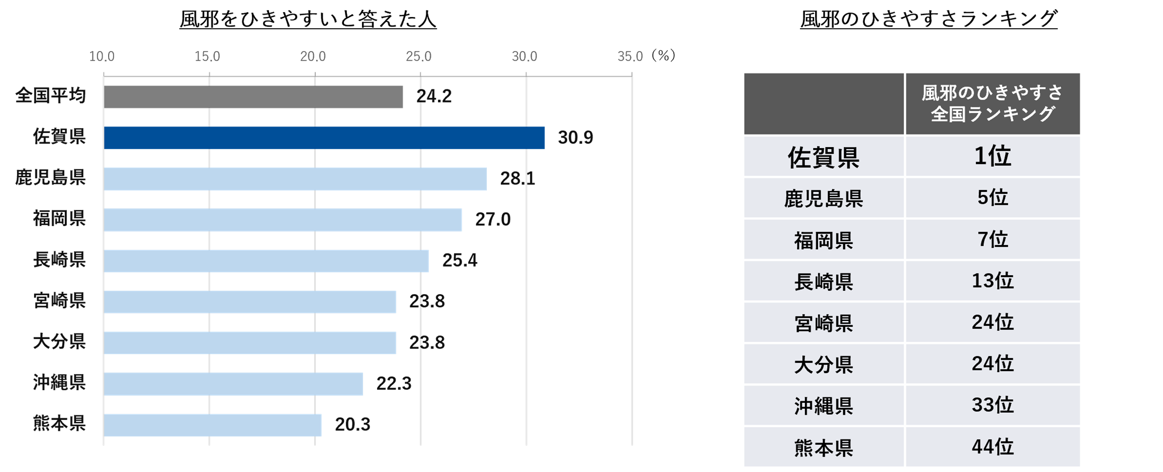 大腸環境の状態を探る14項目の「便秘指標」のうち、特に冬の時期に気になる『風邪のひきやすさ』については、佐賀県では30.9%が“風邪をひきやすい” (「ひきやすい」3.9%と「どちらかといえばひきやすい」27.0%を合わせた「ひきやすい」計)と回答しており、九州地方で最も風邪をひきやすい県となりました。これは全国47都道府県においてもトップでした。