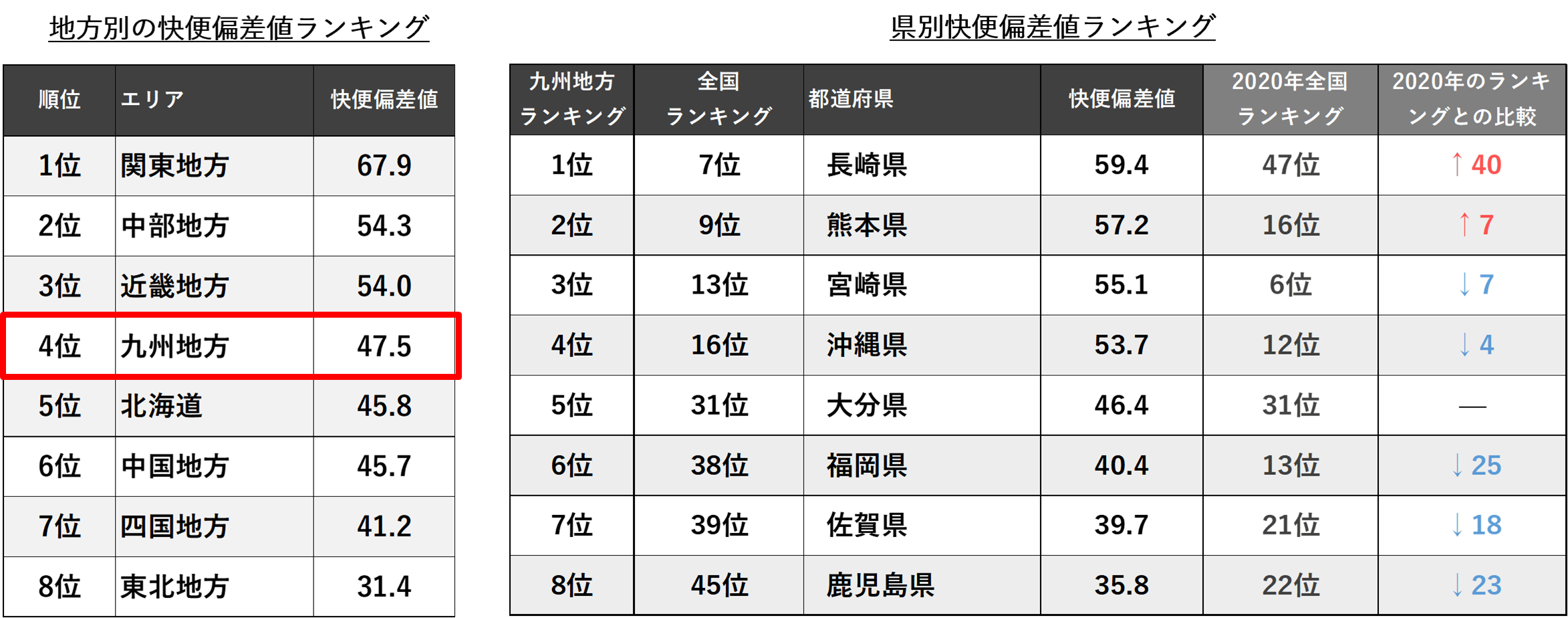 ①九州地方全体では「大腸に不調がある人」も「便秘の人」も全国平均並み。しかし、快便偏差値を県別でみると