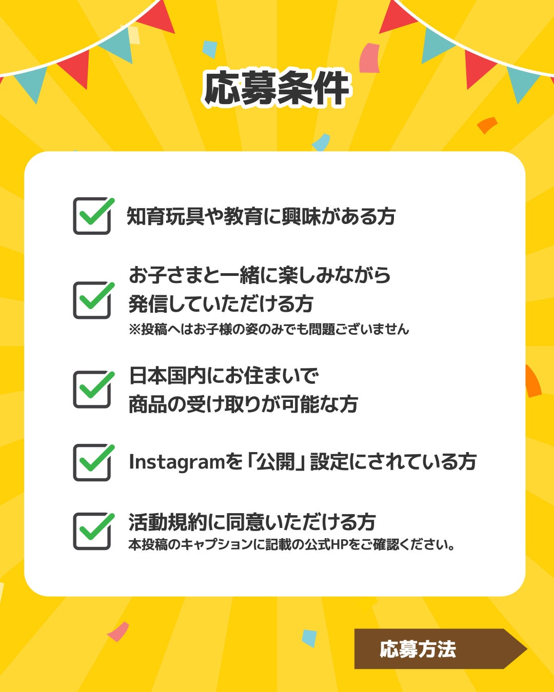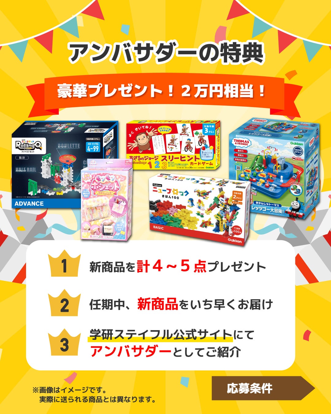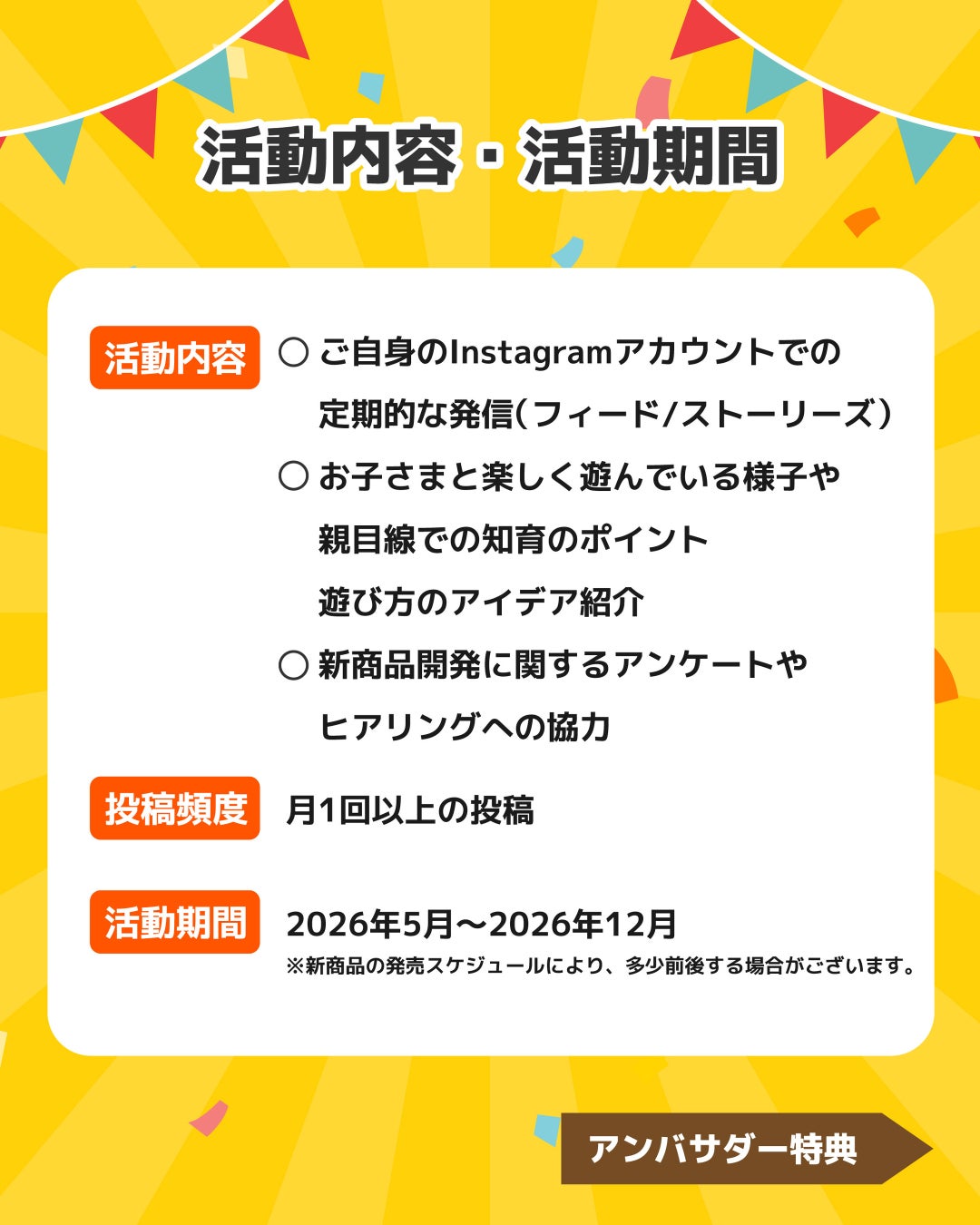 アンバサダーに就任された方には、任期中に発売される注目の新商品(計4~5点、2万円相当)をご提供。お子さまと一緒に楽しみながら、知育のアイデアや遊びの広がりをInstagramで発信していただくパートナーを募集します。
