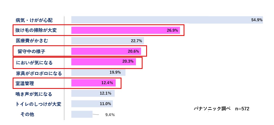一番多かった回答は「病気・けがが心配」で54.9%、次いで「抜け毛の掃除が大変」、「医療費がかさむ」、「留守中の様子」、「においが気になる」が上位にあがりました。