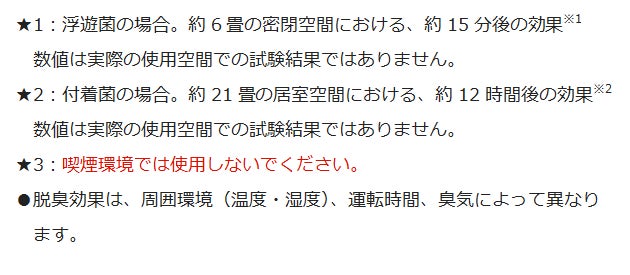 ※2:【試験機関】一般財団法人北里環境科学センター【試験方法】約21畳の居室で、室内中央と室内奥に置いたシャーレに付着させた菌数を測定【除菌の方法】次亜塩素酸 空間除菌脱臭機(F-MV5400)を風量「強」・加湿「標準」・電解強度「強」運転で実施【対象】シャーレに付着した菌【試験結果】約12時間で99%以上抑制〈試験番号〉北生発2022_0052号