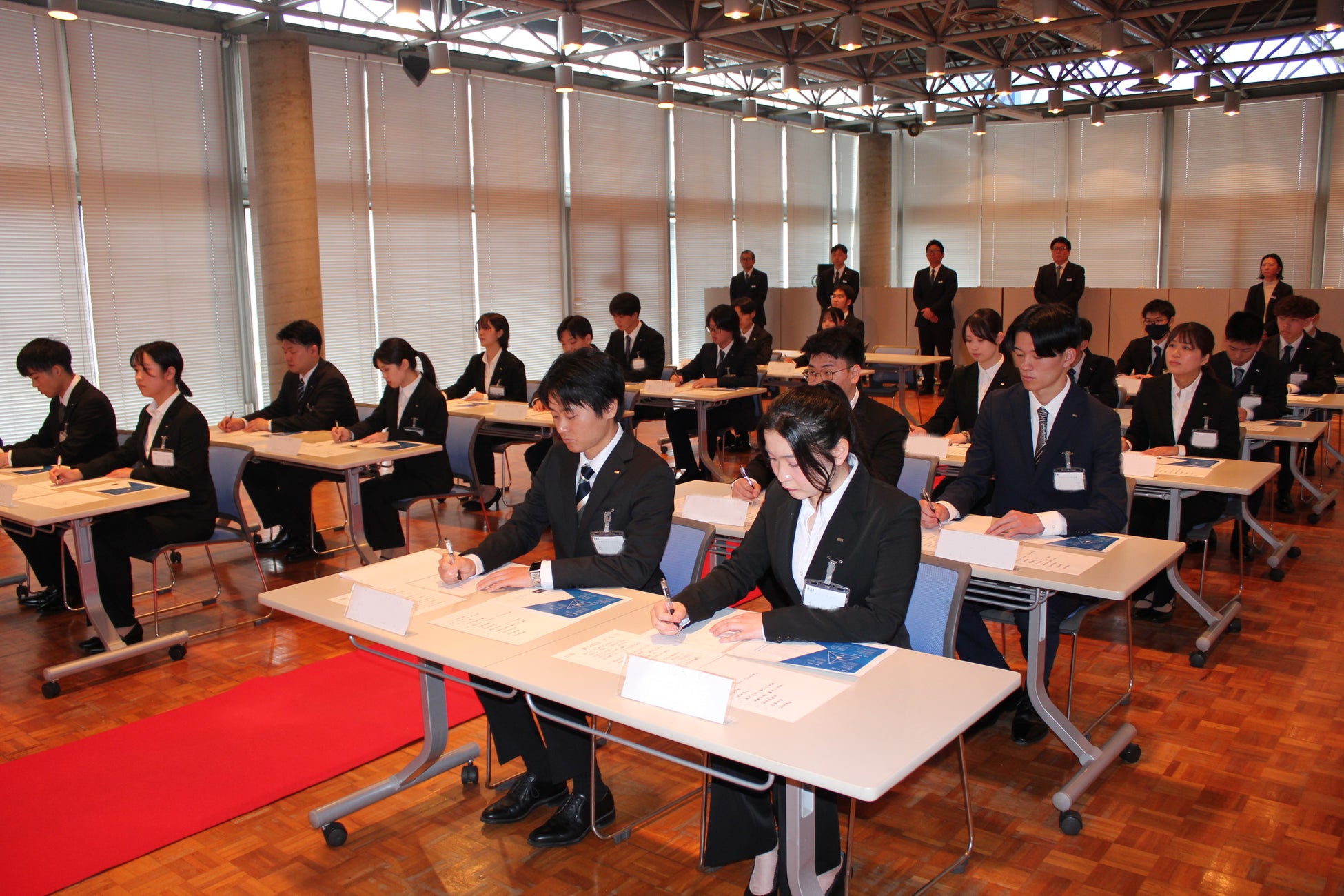 その後、新入社員を代表して総合職の中西 春平が挨拶し、誓いの言葉を力強く宣言しました。新入社員への歓迎の言葉では入社2年目の先輩社員、生産・調達本部 技術部 刃物技術の前原 大和が登壇し、自身の経験から新入社員へのアドバイスや激励の言葉を贈りました。